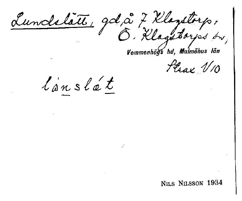 ”K. nr 7, 1/6 mtl, kallas Lundslätt, äges av hemmansägare Nils Persson; areal 22,5 har (åker), txv jbrf 67 300 kr., därav 62 399 jbrv och 5000 tomt-o. instriv., å a. f. 1 500.”